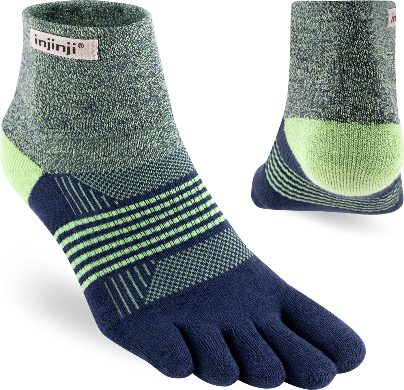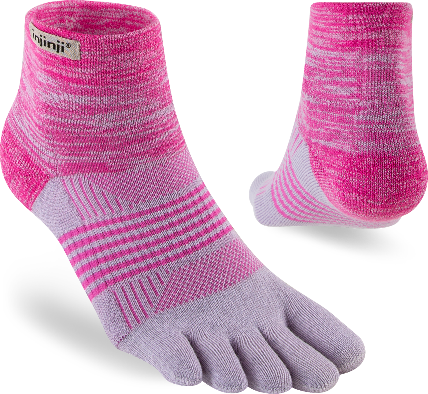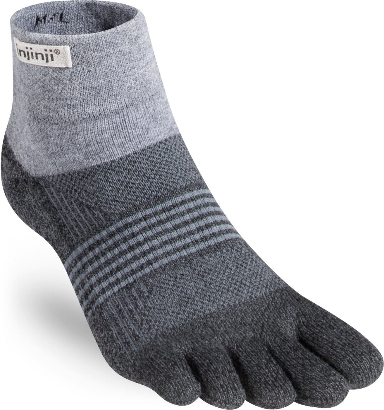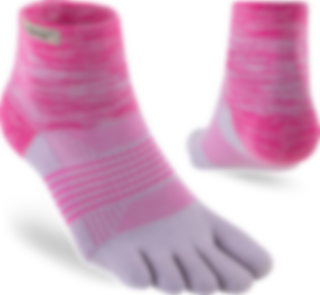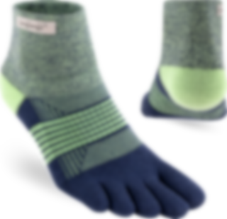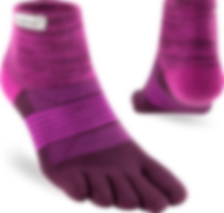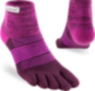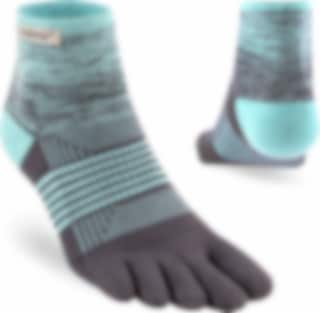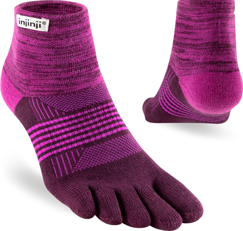 Trailserien til Injinji er konstruert for å takle ujevnt og uforutsigbart terreng, ved å tilby best mulig passform, følelse og beskyttelse i alle typer sko. Med en dobbelt elastisk mansjett, holder man skitt og rask ute. Høyden på denne modell er Minicrew, det vil si like over ankel. Tykkelse er Midweight (medium tykkelse). Tilpasningen av tærne er redesignet for en bedre og tettere passform av kvinners føtter.