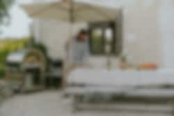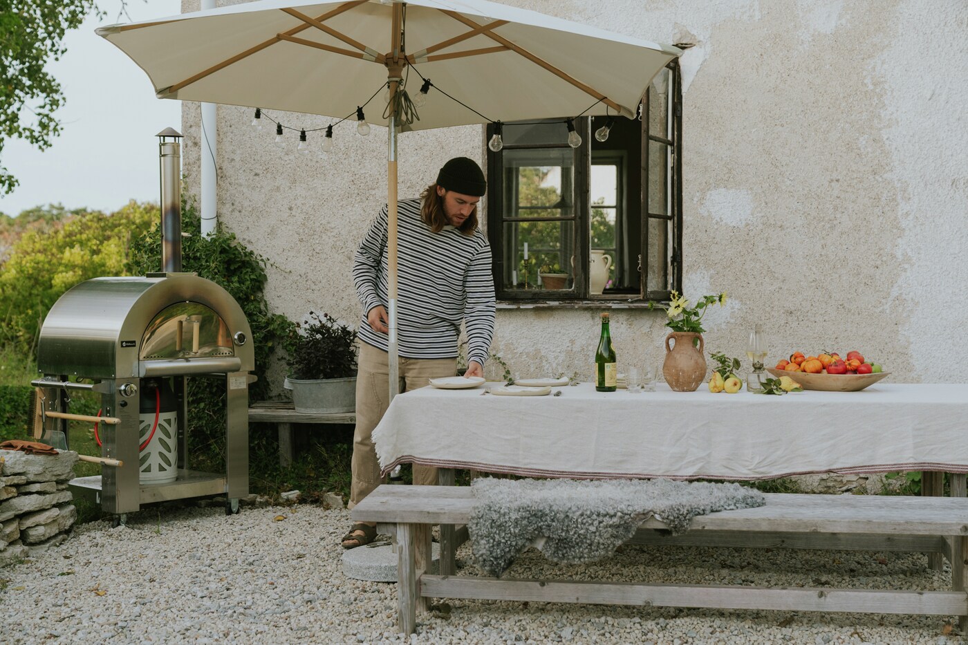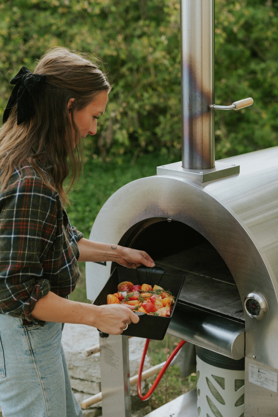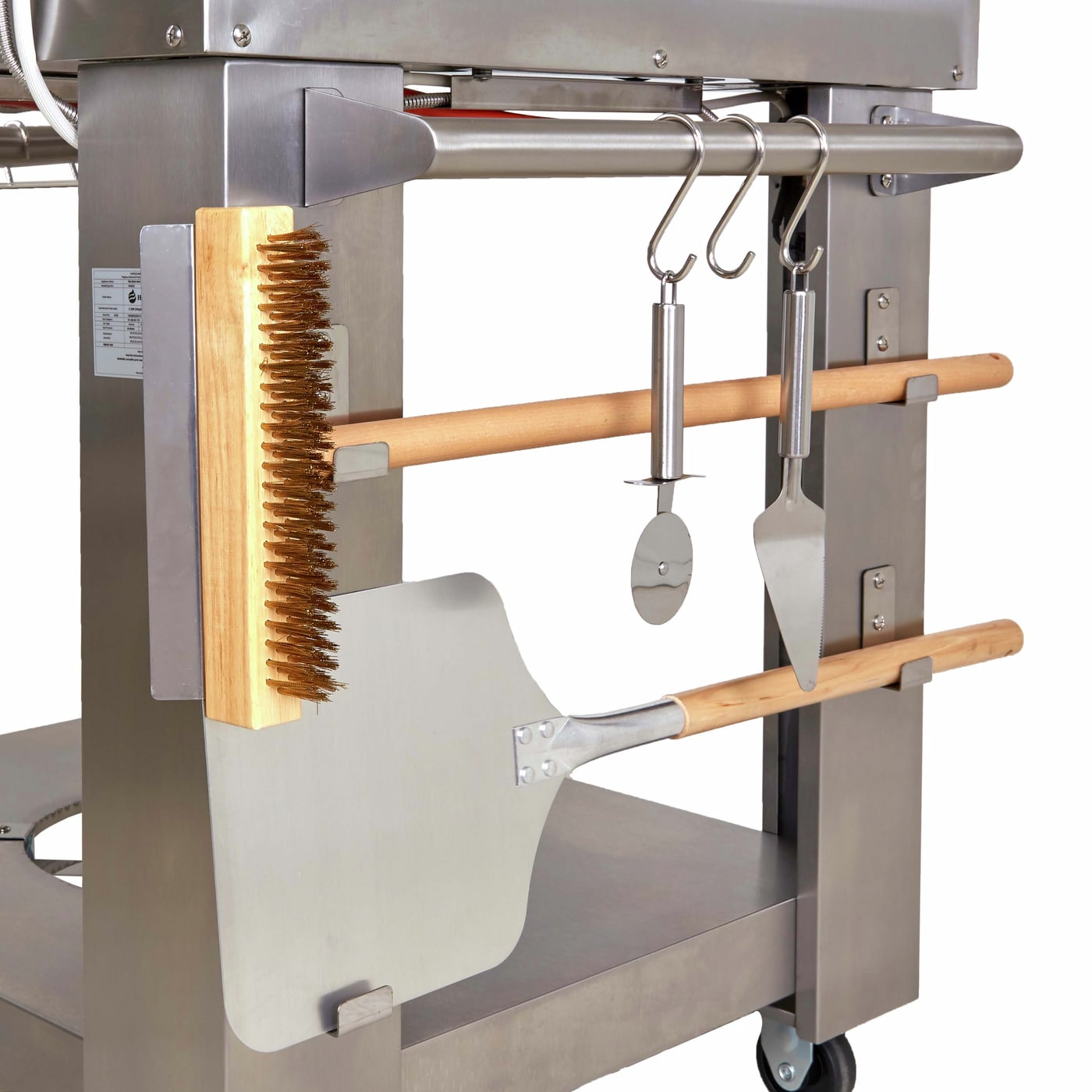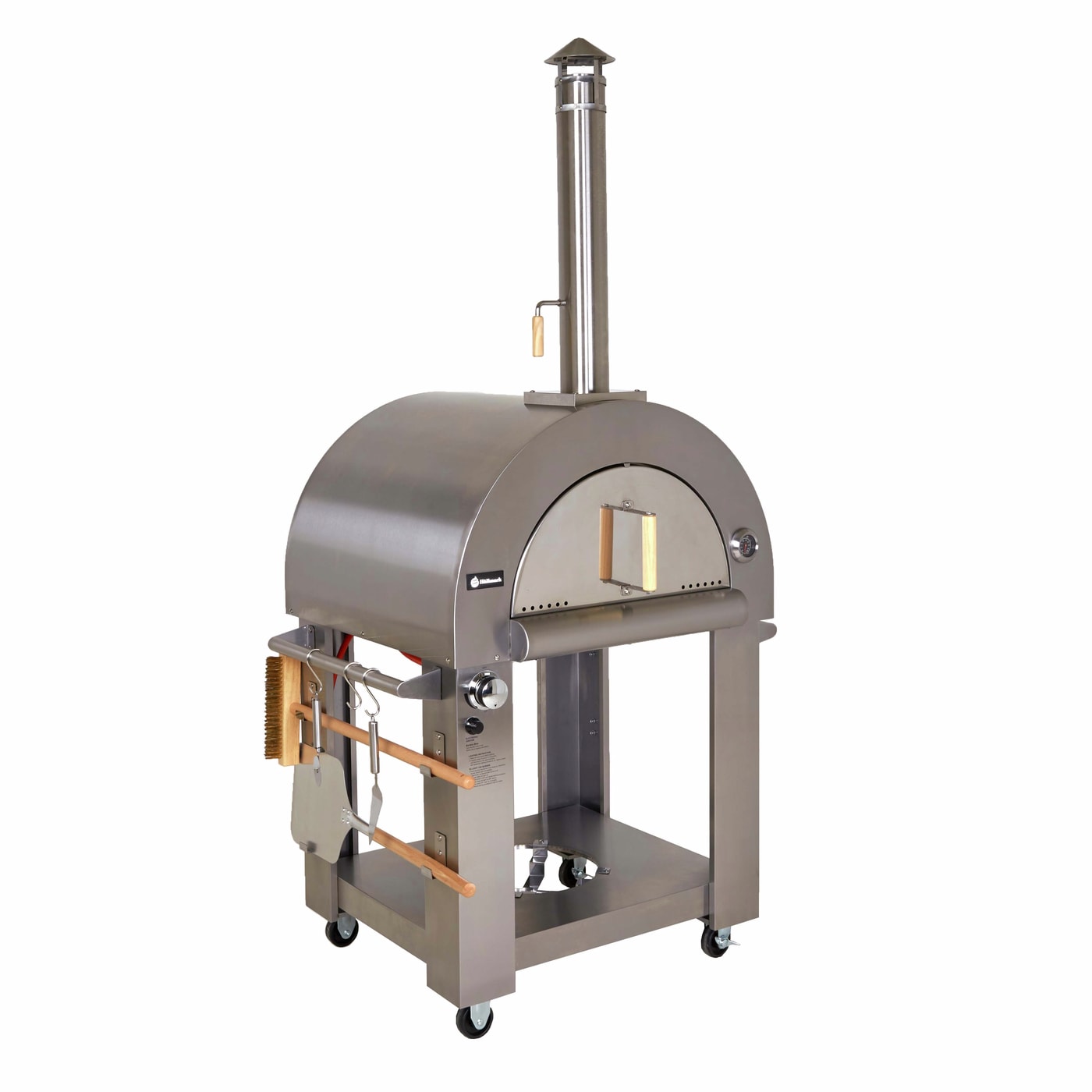 Ta pizzabaking til et helt nytt nivå på utekjøkkenet. Hällmarks pizzaovn har en pizzastein i bunnen som gir den fantastiske autentiske steinovnsbakte kvaliteten på det du lager. Ovnen fyres enkelt med LPG, eller med ved på autentisk italiensk vis om du ønsker det. Ovnen er laget av rustfritt stål og er montert på en praktisk vogn med låsbare hjul for enkel bevegelse. Pakken inneholder også redskaper, som pizzaspade, børste til stekeovn, pizzakutter, skrape, og kroker til redskapene slik at du kan henge dem pent og lett tilgjengelig ved siden av vognen. Ovnen er utstyrt med termostat slik at du enkelt kan holde styr på temperaturen. Askebeger under for enkel tømming. Både ovnsdøren og skorsteinen har solide håndtak. Mulighetene med Hällmarks pizzaovn er uendelige: Stek små eller store pizzaer, brun et kjøttstykke, stek grønnsaker eller hvorfor ikke bake brødet. Stekeareal på 0,48 m² (64 cm x 75 cm). Fyringstid med ved er ca 20 minutter. Regulator for LPG er ikke inkludert.