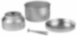 Campingsett består av kjele 2 liter i aluminium, stekepanne Ø180mm, kaffekjele 0,9 liter i aluminium, avtagbart håndtak og futeral.